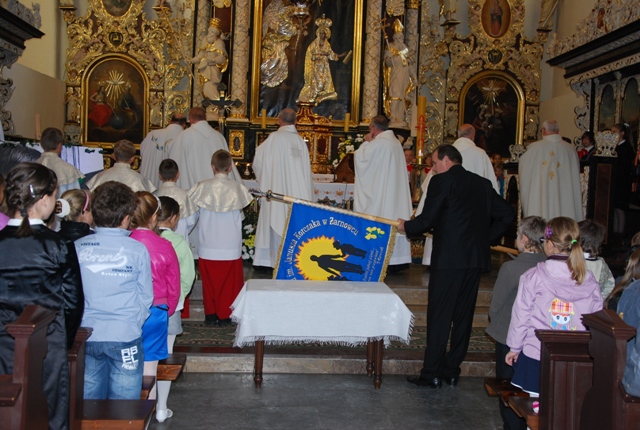 P. Andrzej Abraham wnosi Sztandar na uroczystą Eucharystię do Kościoła Parafialnego p.w. Zwiastowania Pana w Żarnowcu.