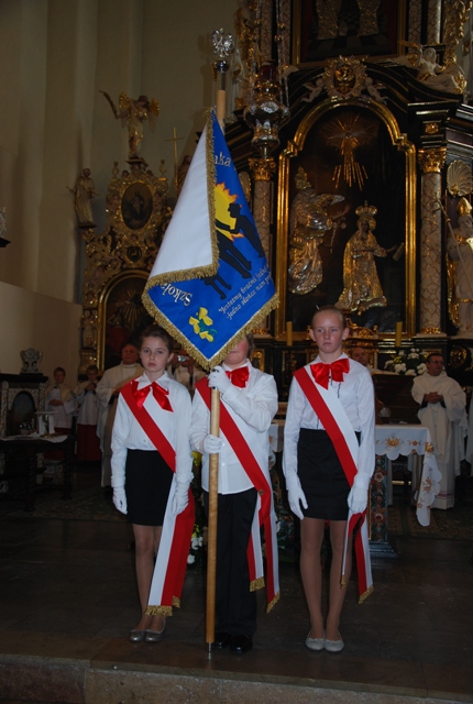 Poczty Sztandarowe zaprzyjaźnionych szkół podstawowych i gimnazjum.