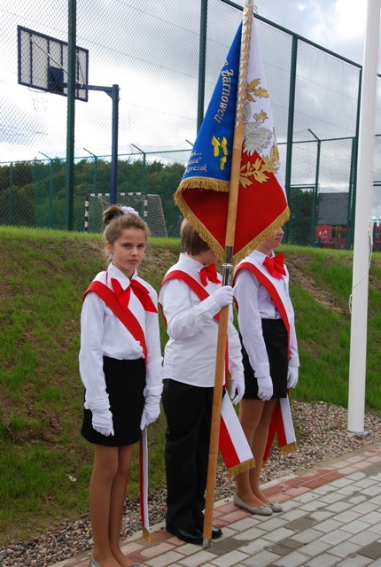 Pierwszy Poczet Sztandarowy Szkoły Podstawowej im. Janusza Korczaka w Żarnowcu: Martyna Muttka, Karolina Lademann, Jan Jetke.