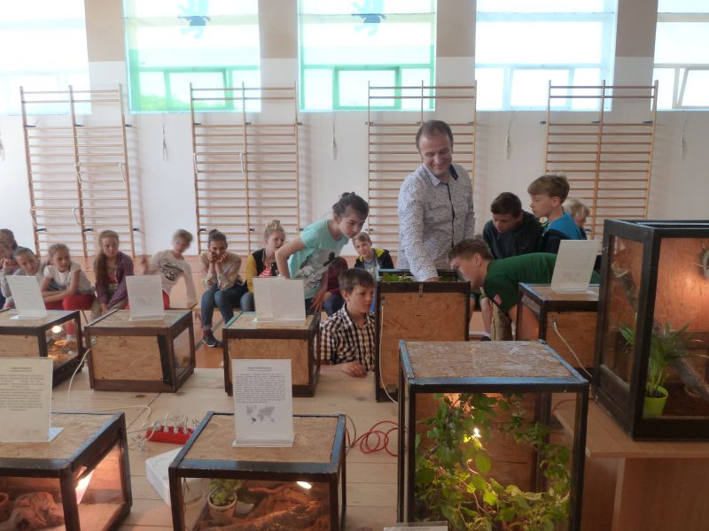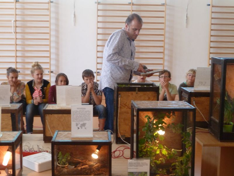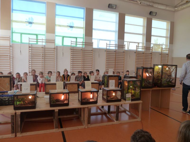 W odpowiednich akwariach i pojemnikach zamieszkiwały kameleony, agamy, gekony, modliszki, patyczaki, straszyki, liśće i pająki.