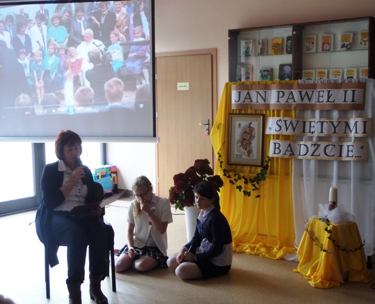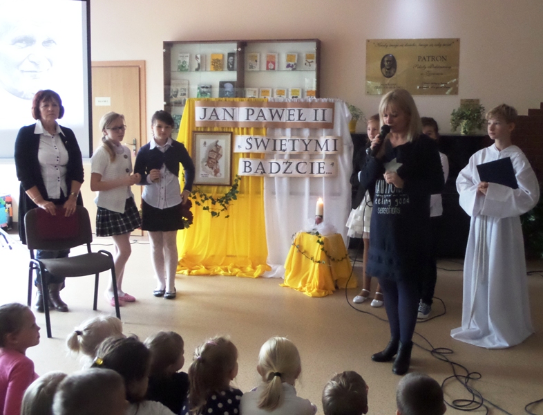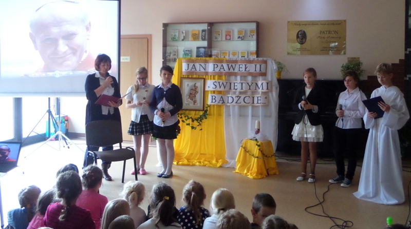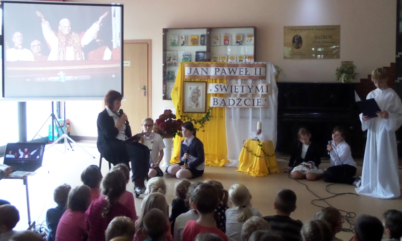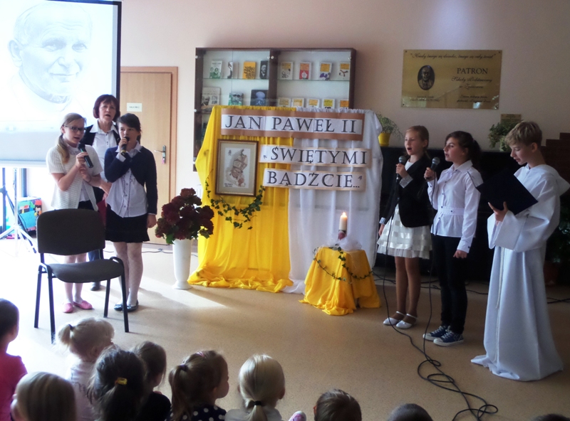 Dialog uczniów z narratorem na temat pontyfikatu Papieża, przeplatany piosenkami religijnymi, zakończył się modlitwą wstawienniczą do Świętego Jana Pawła II. Całość poparta była multimedialną projekcją obrazów z życia i nauczania papieża Jana Pawła II, przygotowaną przez panią Monikę Gnutek.