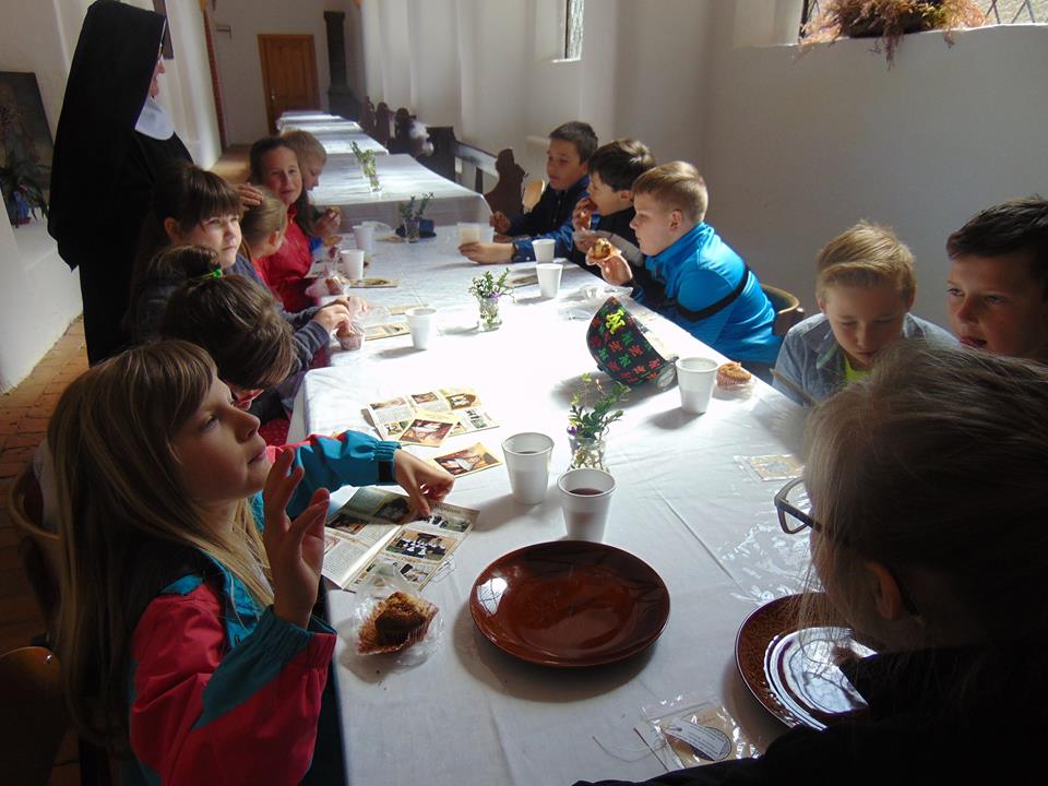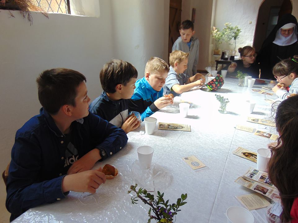DZISIAJ UCZNIOWIE KLAS 4 I 6 ZOSTALI UGOSZCZENI PRZEZ SIOSTRY ZAKONNE - BENEDYKTYNKI. DZIECI ZOSTAŁY BARDZO MIŁO PRZYJĘTE. MOGŁY POSŁUCHAĆ HISTORII POWSTANIA ZAKONU ORAZ OBEJRZEĆ SKARBIEC. NA KONIEC SIOSTRY ZAKONNE POCZĘSTOWAŁY ICH PRZEPYSZNYMI BABECZKAMI. NAJWAŻNIEJSZE JEST JEDNAK TO, ŻE KAŻDY UCZEŃ ORAZ NAUCZYCIEL DOSTAŁ OD SIÓSTR POŚWIĘCONY MEDALIK.