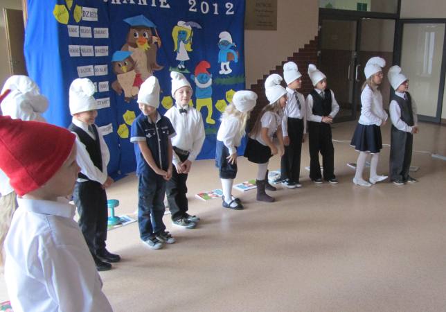 Dzieci ubrani w odświętne stroje zaprezentowały się rodzicom i swoim kolegom z klas 0 - III w krótkiej inscenizacji pt. ,,Smerfy w szkole”, w wierszach i piosenkach.