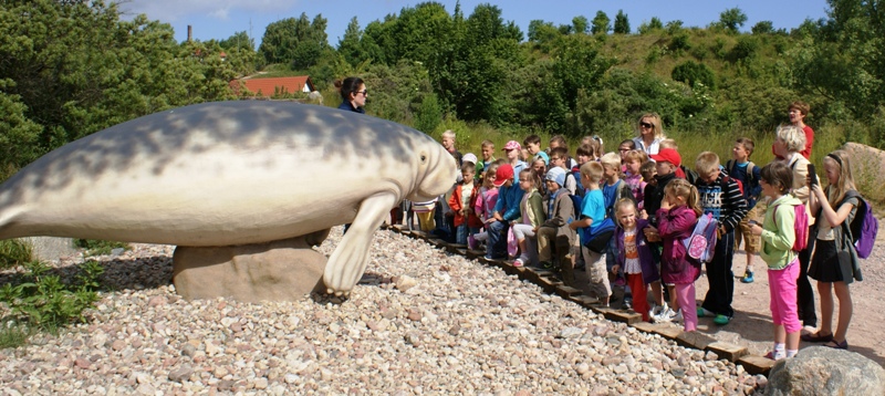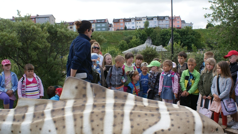 W parku przywitała dzieci miła pani przewodniczka, która zaprosiła wszystkich na ,, spacer po dnie oceanu” rozpoczynający się od poznania jednego z największych okazów - kaszalota.