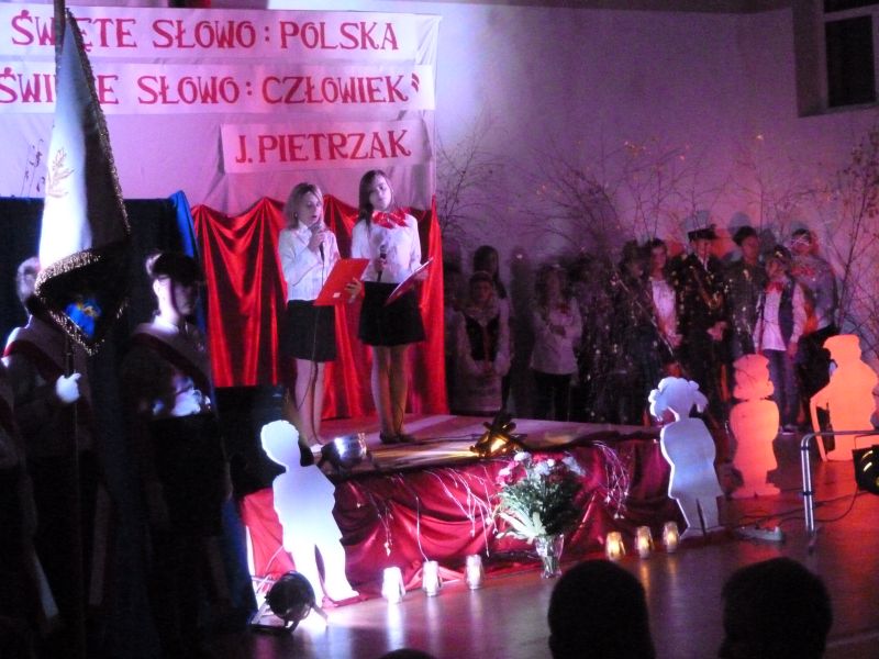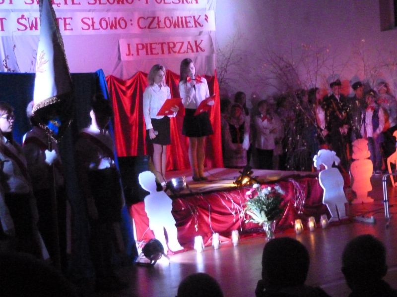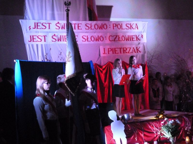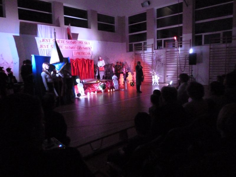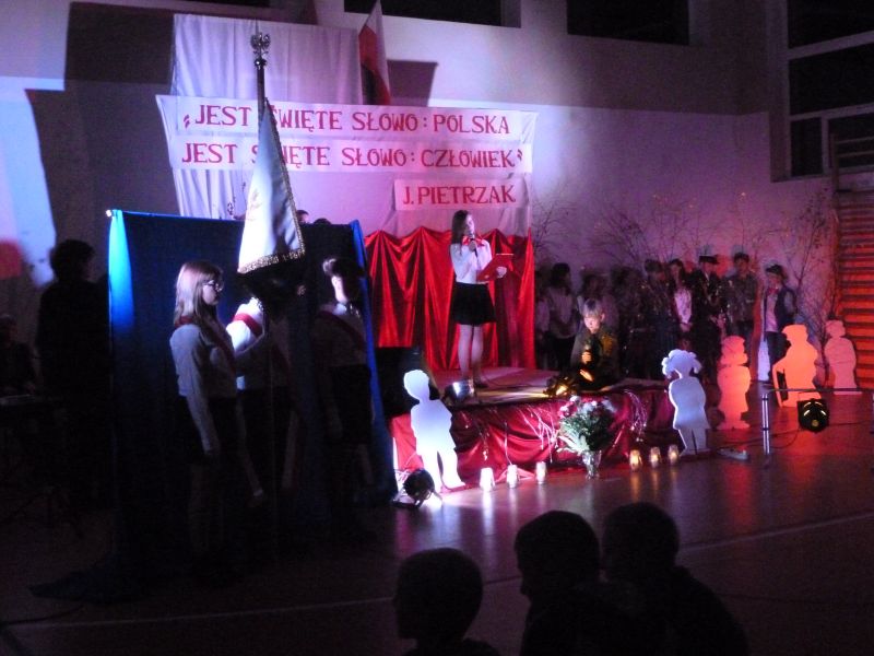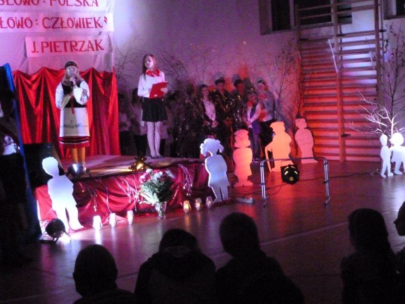 Dnia 10 listopada 2013 roku o godz. 1700 w naszej szkole odbyła się uroczysta wieczornica z okazji Święta Niepodległości pt. „ Jest święte słowo: Polska! Jest święte słowo: Człowiek! – opracowana tradycyjnie przez p. Halinę Gojke.