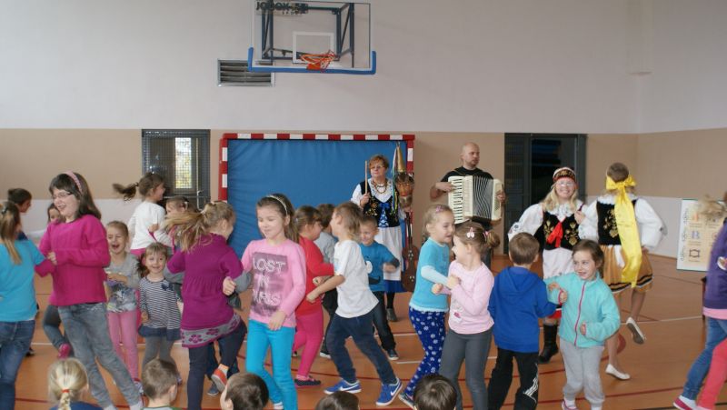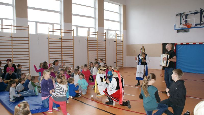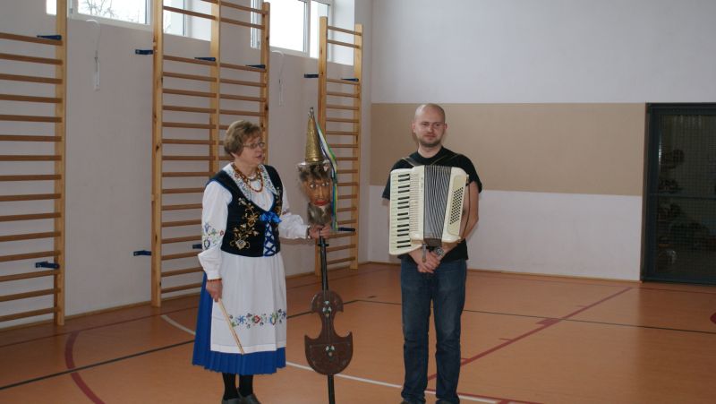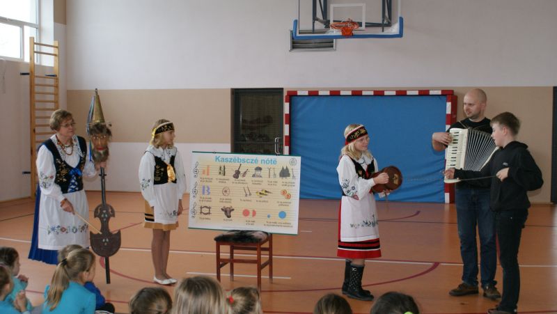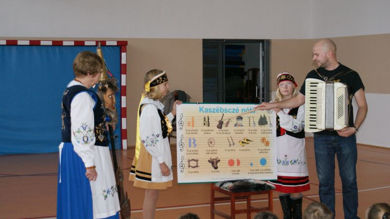 Na początku p. Mateusz na akordeonie, a p. Elżbieta na diabelskich skrzypcach, zaprezentowali dzieciom krótki program muzyczny. Dzięki czemu uczniowie zapoznali się z kilkoma piosenkami śpiewanymi dawniej przez naszych przodków na Kaszubach.