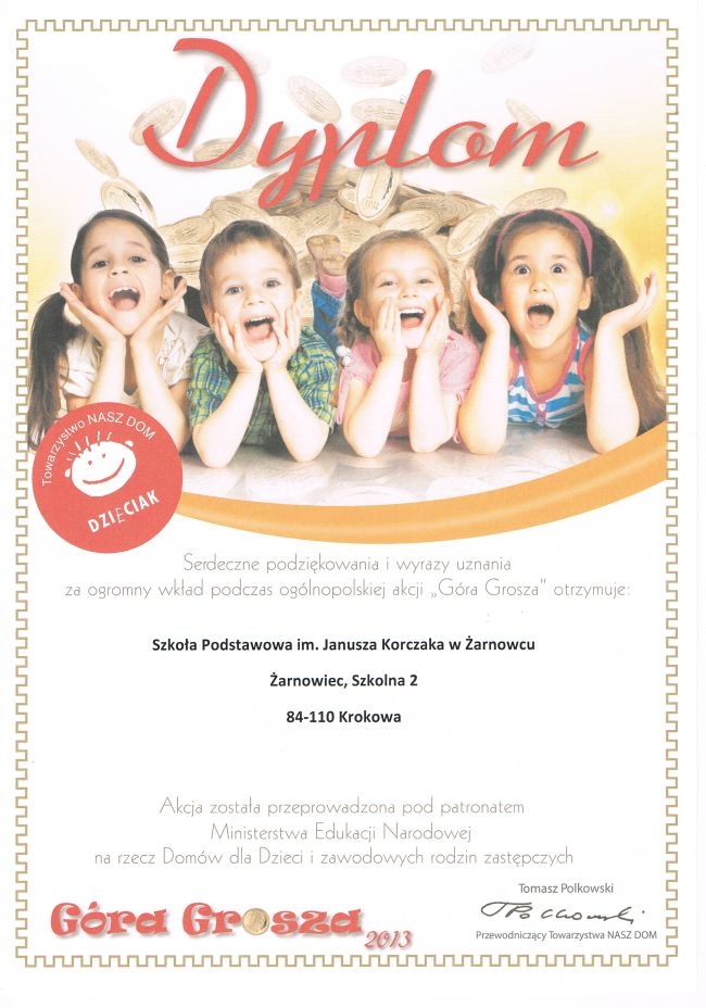 Już po raz XIV nasza szkoła przystąpiła do akcji "Góra Grosza". Jeden grosz znaczy niewiele, ale Góra Grosza potrafii już zdziałać cuda. W tym roku Samorząd Uczniowski (Mikołaj Obszyński, Kamil Hincke, Gabriel Golla) naszej szkoły zebrał w sumie 10.000 groszy co daje łącznie 100 zł. Dziękujemy wszystkim, którzy dołączyli się do nas i mamy nadzieję, że w przyszłości uda nam się zebrać jeszcze więcej.