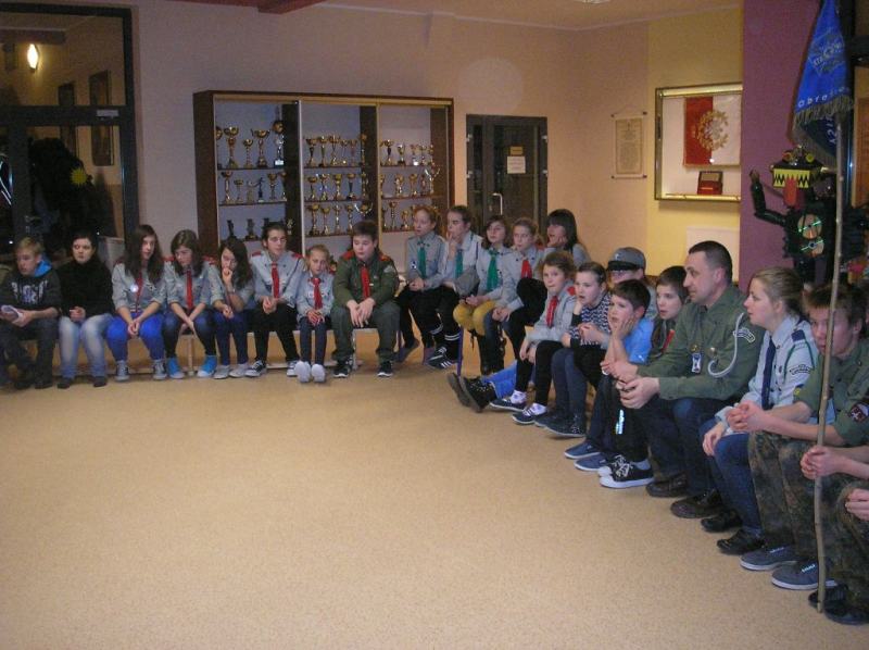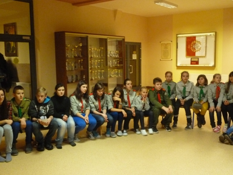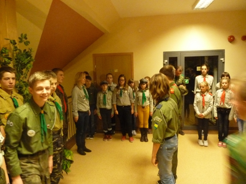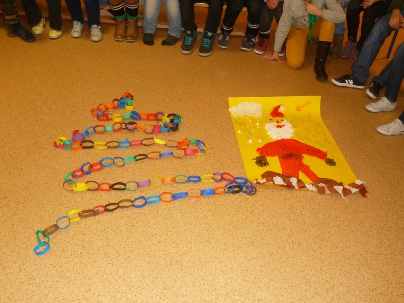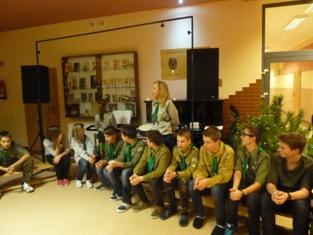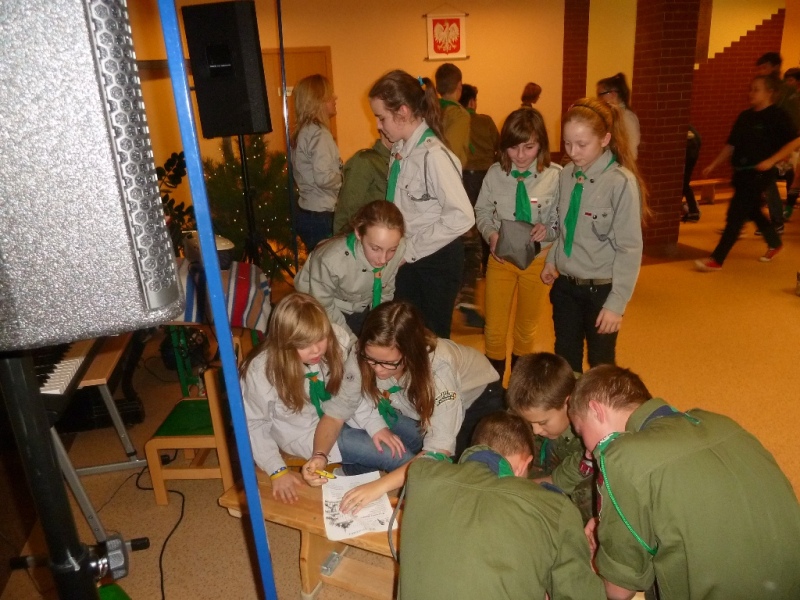 Po czym harcerze śpiewali kolędy, rozmawiali o tradycjach Świąt Bożego Narodzenia w Polsce i innych krajach europejskich. Na podsumowanie pogadanki o tradycjach bożonarodzeniowych drużyny rozwiązywały krzyżówki świąteczne oraz wykonywały prace plastyczne. Każda drużyna miała za zadanie wykonać postać Św. Mikołaja i świąteczny łańcuch, z którego uformowała świąteczną choinkę.