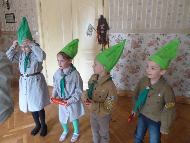Przy akompaniamencie grzechotek zaśpiewali piosenkę swojej gromady „My jesteśmy Leśne Skrzaty”. Wystąpili w samodzielnie wykonanych z krepiny czapkach skrzatów.