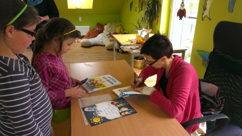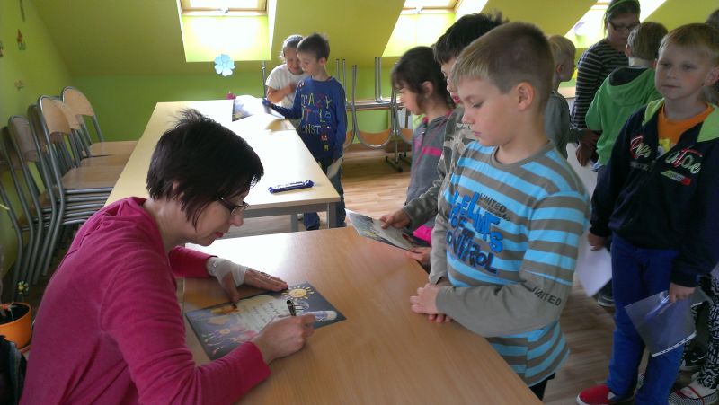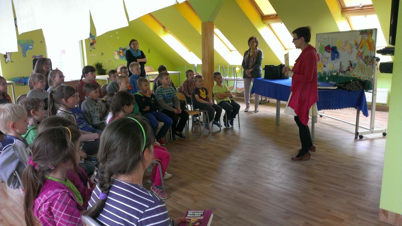 Na spotkaniu z uczniami autorka przeczytała fragment swojej książki „Okropny Maciuś łapie Gulgokura”. Dzieciom bardzo spodobała się zabawa w wymyślanie, jak może wyglądać postać o tak dziwnej nazwie. Dla swoich fanów przygotowała również zagadki związane z baśniami świata. Były też zabawy ruchowe z wierszem w tle.