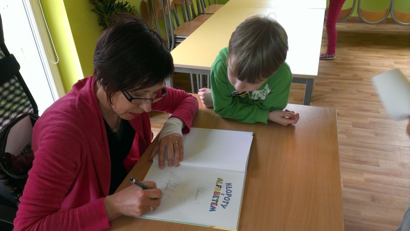 Nasi uczniowie zapoznali się z twórczością pisarki dużo wcześniej, m.in. podczas zajęć lekcyjnych. Czytaliśmy fragmenty książek tj.: „Leniwe literki”, „Kłopoty z alfabetem” oraz serii „Okropny Maciuś”. Książki bardzo się dzieciom podobały i z niecierpliwością oczekiwały przybycia ich autorki.