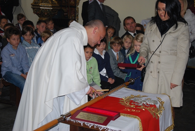 P. Andrzej Abraham wnosi Sztandar na uroczystą Eucharystię do Kościoła Parafialnego p.w. Zwiastowania Pana w Żarnowcu.
