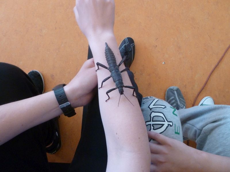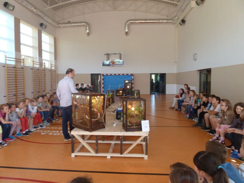 Podczas „Żywej lekcji przyrody” uczniowie mogli dowiedzieć się o właściwościach przystosowawczych danych okazów, ich wyglądzie i zachowaniu. Uczniowie mieli możliwość zaobserwowania, jak kameleon zjada pasikonika, straszyki spacerowały po rękach odważnych uczniów. Skrajne emocje i piski dziewczynek budziły pająki i wije. Po zakończonej lekcji uczniowie zadawali prowadzącemu pytania, na które pan Jarosław wyczerpująco odpowiadał. Dzieci mogły zakupić sobie własnego patyczaka lub straszyka.
