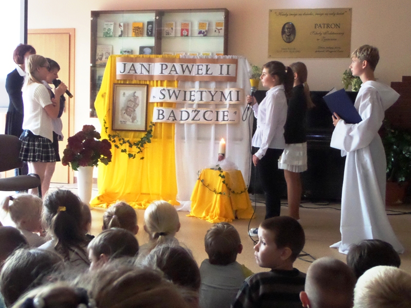 Dialog uczniów z narratorem na temat pontyfikatu Papieża, przeplatany piosenkami religijnymi, zakończył się modlitwą wstawienniczą do Świętego Jana Pawła II. Całość poparta była multimedialną projekcją obrazów z życia i nauczania papieża Jana Pawła II, przygotowaną przez panią Monikę Gnutek.