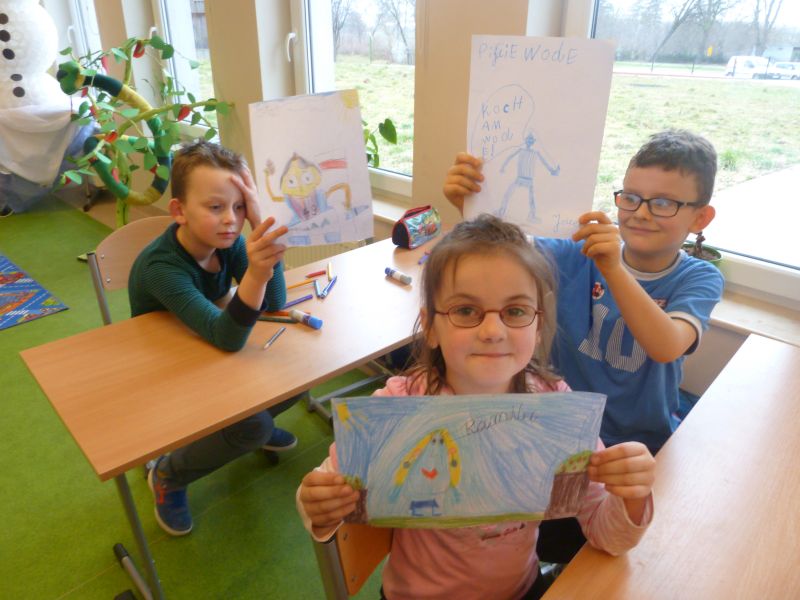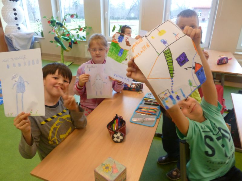 2. Drugim zadaniem było stworzenie postaci Wodolubka stworka, który lubi wodę. Dzieci mogły dokonać wyboru: namalować tę postać lub stworzyć ją z dowolnie wybranych materiałów. Większość uczniów wykonała prace plastyczne na kartce formatu A4, używając kredek, pisaków, flamastrów. Grupa chłopców z klasy Ia wykonała kukiełkę z plastikowych butelek po wodzie, nakrętek i woreczków foliowych.